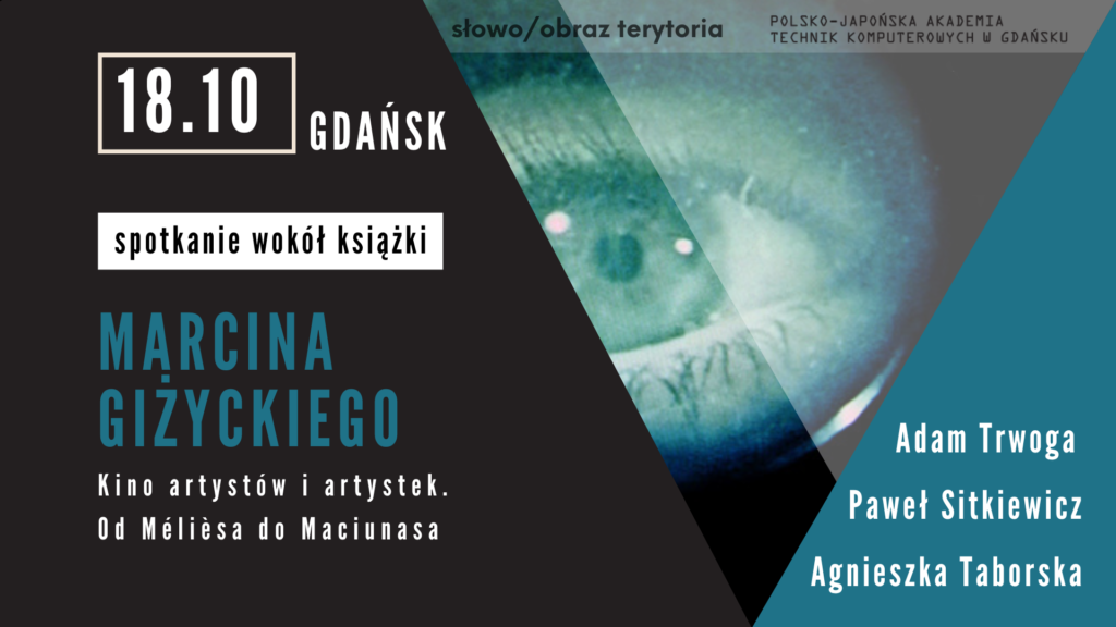 Zapraszamy na spotkanie wokół książki Marcina Giżyckiego „Kino artystów i artystek. Od Mélièsa do Maciunasa”, które odbędzie się 18 października na Wydziale Sztuki Nowych Mediów Polsko-Japońskiej Akademii Technik Komputerowych w Gdańsku (ul. Brzegi 55, aula B015) o godz. 16:00.