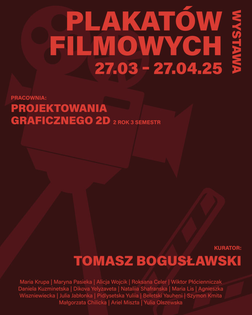 Wystawa prezentuje plakaty filmowe stworzone przez studentów II roku studiów na Wydziale Sztuki Nowych Mediów Polsko-Japońskiej Akademii Technik Komputerowych w Gdańsku w pracowni Projektowania Graficznego, pod okiem Profesora Tomasza Bogusławskiego.