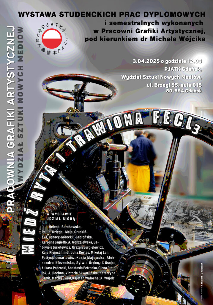 W dniu 03.04.2025 odbył się wernisaż wystawy studenckich prac dyplomowych i semestralnych wykonanych w Pracowni grafiki artystycznej pod kierunkiem dr Michała Wójcika. Wystawa obejmuje prace wykonane m.in. w technice linorytu, miedziorytu, akwaforty i akwatinty.