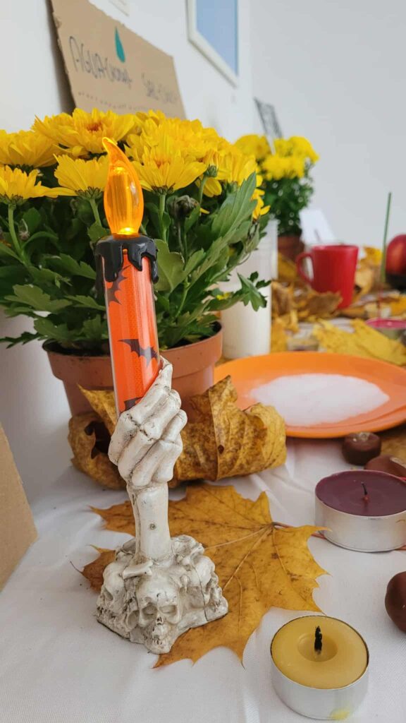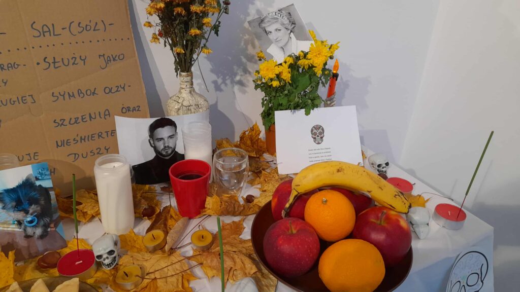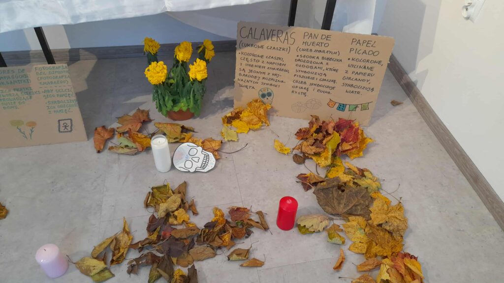 Centralnym punktem był ołtarz (ofrenda) – tradycyjna instalacja, na której umieszczono zdjęcia, świece, kwiaty, papierowe ozdoby i przedmioty symbolizujące więź między światem żywych a duchami zmarłych. Ołtarz został zaprojektowany i wykonany przez studentów z pomocą dydaktyka.