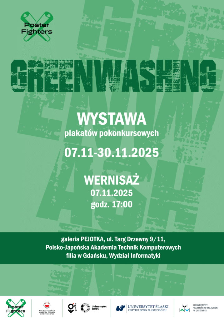 7 listopada o 17:00 zapraszamy na wernisaż wystawy pokonkursowej Poster Fighters: GREENWASHING w Galerii PEJOTKA (PJATK Gdańsk, ul. Targ Drzewny 9/11).