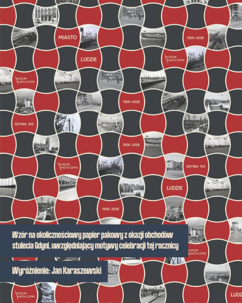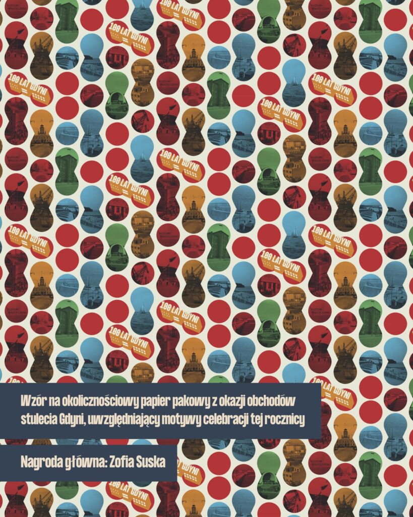 • wzór na okolicznościowy papier pakowy z okazji obchodów stulecia Gdyni, uwzględniający motywy celebracji tej rocznicy.