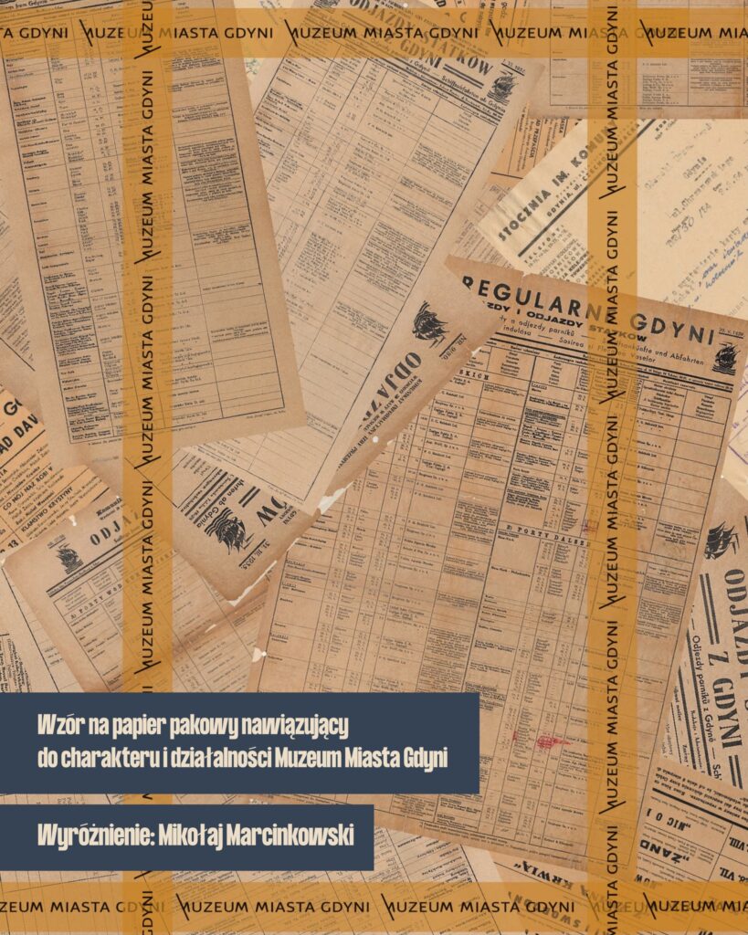 • wzór na papier pakowy nawiązujący do charakteru i działalności Muzeum Miasta Gdyni,