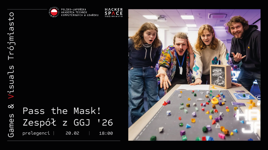 Jako prelegenci zawitają również Pass the Mask! – Zespół z GGJ ’26 Zespół 5 indywidualności których zderzył ze sobą wspólny cel – zrobić planszówkę na Game Jamie. Poprowadzą prelekcję pt. “Jak zrobić grę bez prądu* w 48h! – Stwórz planszówkę na Game Jamie!” Kilka przemyśleń związanych z zabraniem się do stworzenia ciekawej planszówki pod presją czasu. Jak poradzić sobie z natłokiem fantastycznych pomysłów? Jak zderzać je z rzeczywistością?